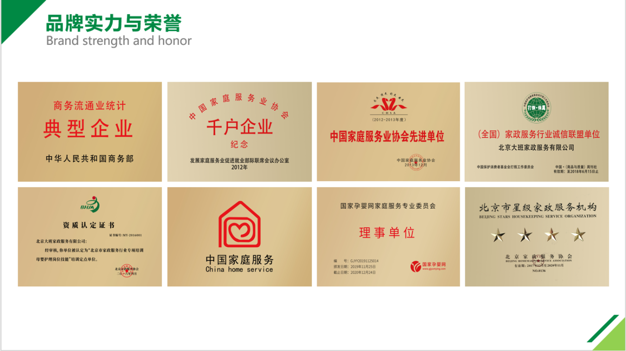 大班家政品牌創(chuàng)立于2006年,全國千戶百強企業(yè),北京四星級(最高星級)服務企業(yè)主要為家庭、醫(yī)院提供月嫂、育兒嫂、高端保姆、家庭教師、病患照護等全品類綜合家政服務,長期開設各項專業(yè)家庭技能培訓。公司依托先審核后培訓,不培訓不入戶的服務理念,十五年間為海內外客戶提供了高品質服務。
